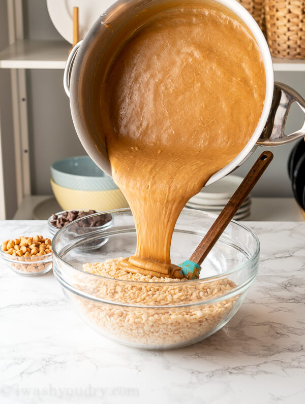 - Press into Pan: Transfer the entire cereal mixture into your prepared 9x13 inch pan.